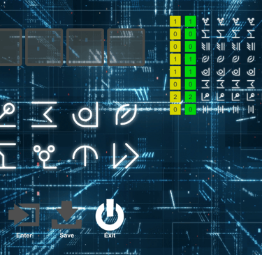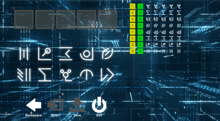 In parts of the game, you'll need to hack computer devices. You'll do this in the hacking mini-game. This game works like mastermind. You guess a combination of symbols and the app tells you how many symbols you have correct. Green represents symbols you've guessed in the correct spot, yellow indicates the correct symbols in the wrong spot. Use logic to figure out the correct code.