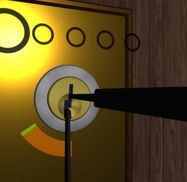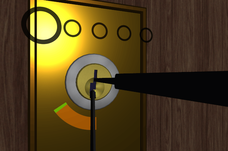The lockpicking mini-game requires you to set 5 tumblers to the correct position while maintaining tension on the lock. You use the mouse and keyboard to raise/lower the rake while using the left/right keys to keep the tension meter green. If tension drops too low or gets too high you need to start over. Later in the game, a timer is added to make it more challenging. Turn all pins blue and gain access what's behind.